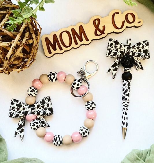 Western Brown Cowprint Bow Bead Wristlet and Pen